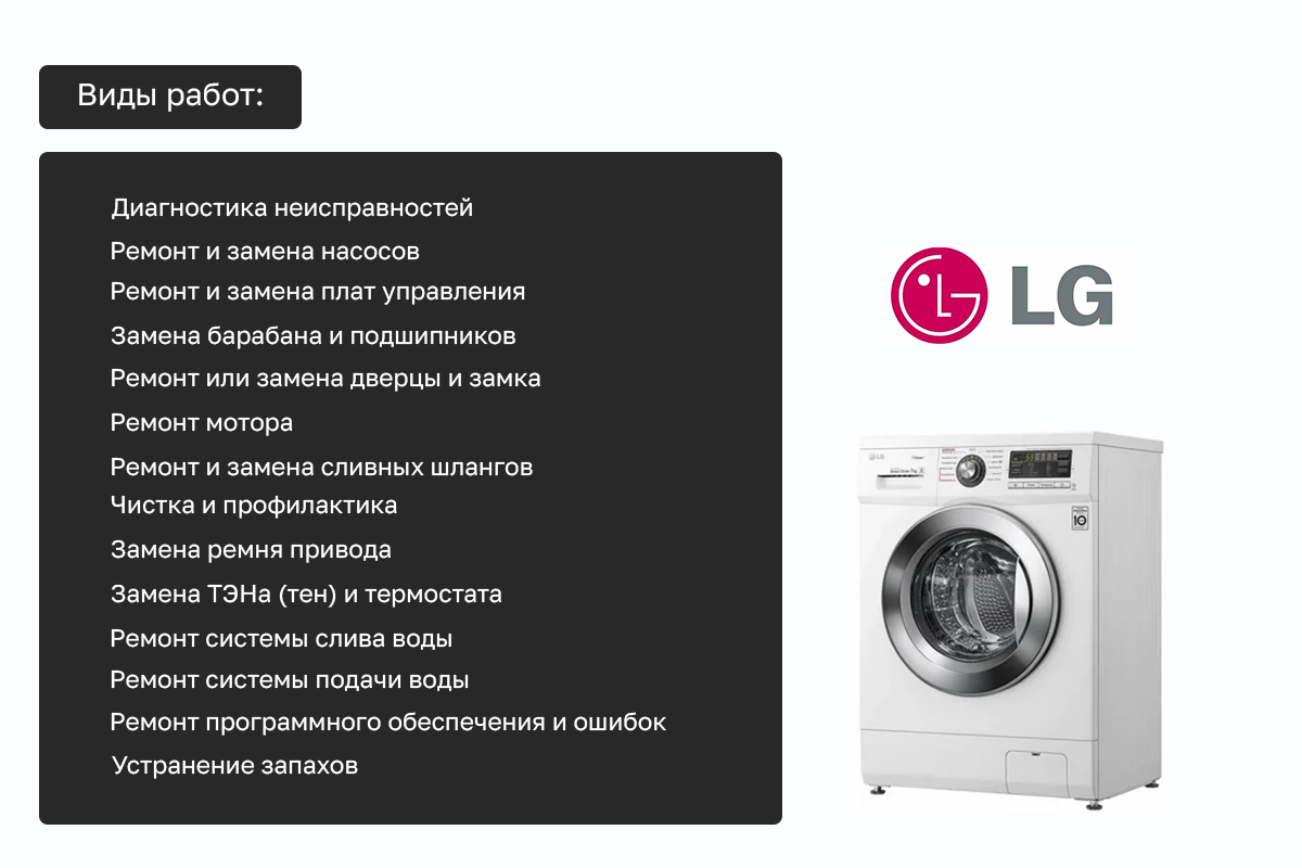 Выезд мастера в день обращения + бесплатная диагностика при ремонте. Оригинальные запчасти LG со склада. Гарантия до 3 лет. Работаем без выходных с 8:00 до 23:00. Цены от 900 ₽.